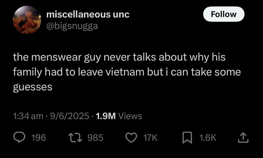 Two days ago, menswear commentator and internet provocateur Derek Guy shared a series of longer posts on X about his family history, ICE’s raids taking place throughout the country, and his view on protests. I think they’re thoughtful and encourage you to go read them yourselves, but to summarize: