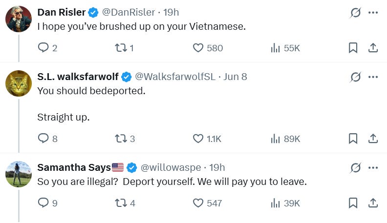 Unfortunately, we don’t live our lives in the physical world any more. We live on the internet, so a bunch of MAGA chuds started jerking off about how much fun it would be to deport him: