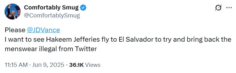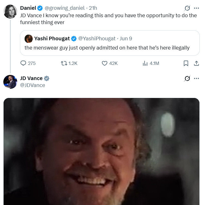 This wasn’t just a group of internet randoms. The sitting Vice President got in on the fun, posting meme reactions to the idea of deporting a menswear commentator: