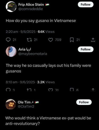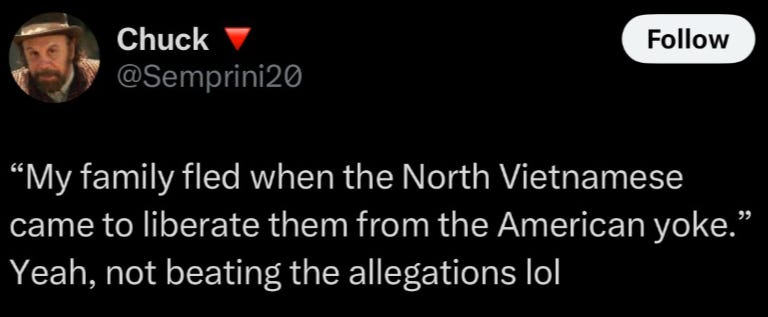Leftists dislike Vietnamese refugees from Communism, because they are assumed to be anti-Communists. Most Vietnamese-Americans are refugees and their descendants. Leftists therefore dislike most Vietnamese-Americans.
