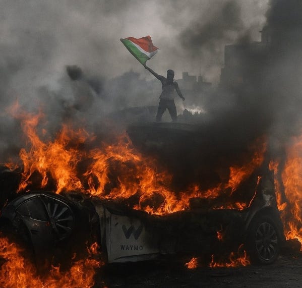 Unfortunately, there are a lot of people for whom activism and protest is essentially a social club. The vast majority of protests in Los Angeles and across the country against ICE have been peaceful. 99% of people are protesting peacefully and being very normal, but there’s a dedicated fringe group of anarchist assholes who show up to every major protest and make things worse. They’re the kind of people who call Waymo taxis to the protest just so they can smash them up and burn them.