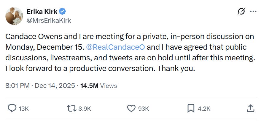 In the taxonomy of conservative personalities I wrote about last year, Owens is a classic grifter. She’s in the game to get as much money and attention as she can.2 Controversy sells and any press is good press, so Owens has been leaning heavily into conspiracies and reaping the rewards. Erika Kirk, whose husband was murdered, thinks this is crass and has said so publicly. The two ended up in a feud, which you will be incredibly relieved to hear has now been set aside after a successful meeting on Sunday.