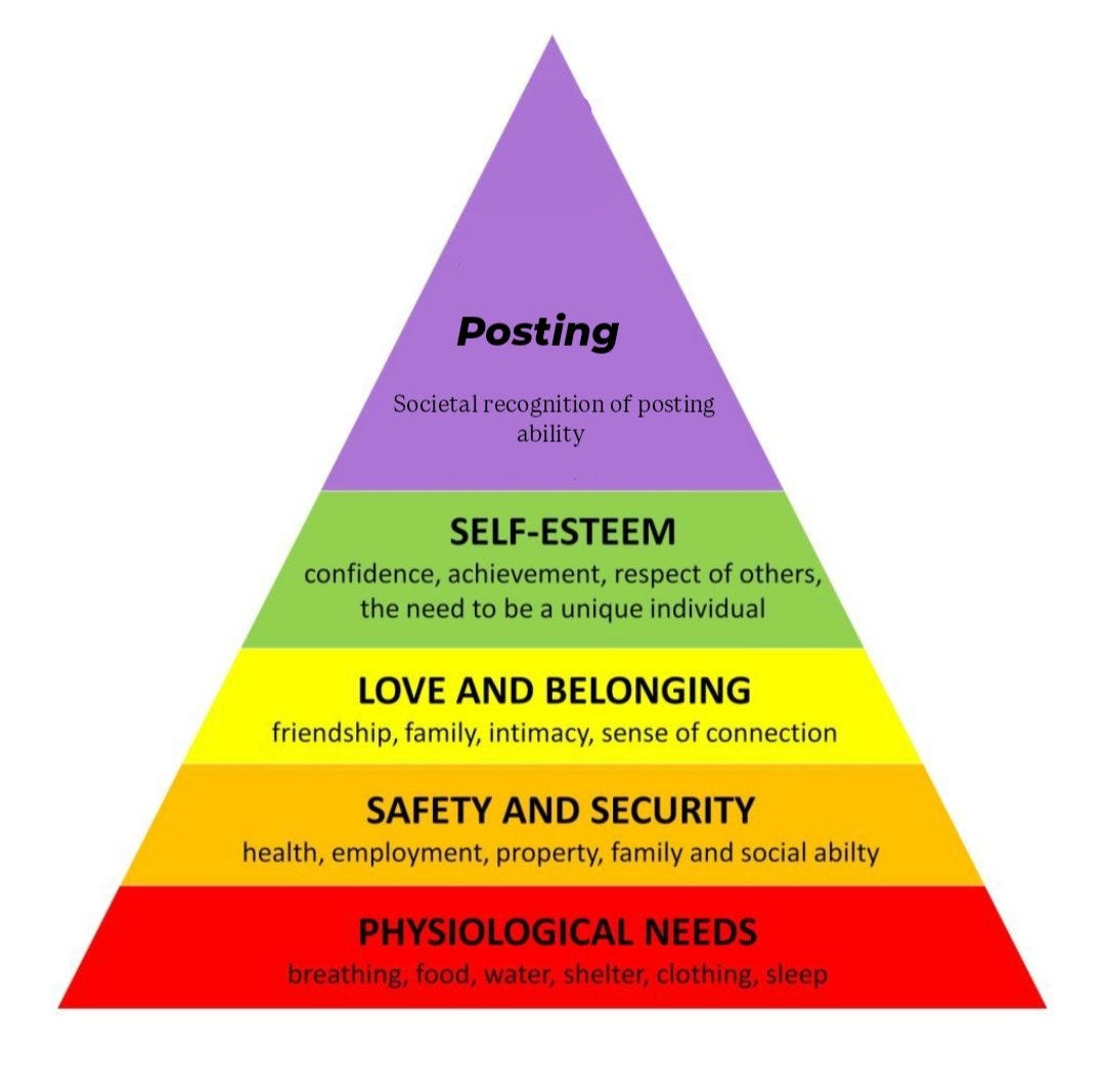 People routinely value the ability to post over money, sex, power, and personal relationships. I would not be at all surprised if there are people who’d rather go hungry than go without posting. See the new and revised Maslow’s Hierarchy of Needs: