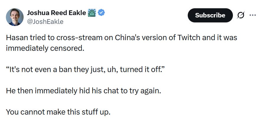 Hasan, now back in America, attempted to multicast his livestream on Twitch and Chinese streaming site Bilibili, but was almost immediately censored and shut down on Bilibili. Twice. The first time appeared to be a technical violation of the rules, but the second time was purely “This guy is talking politics and we don’t allow that”. You will be shocked to learn that Hasan proceeded to defend the censorship, with the argument “Well, every site has rules and I don’t always agree with them, but it’s fine”.