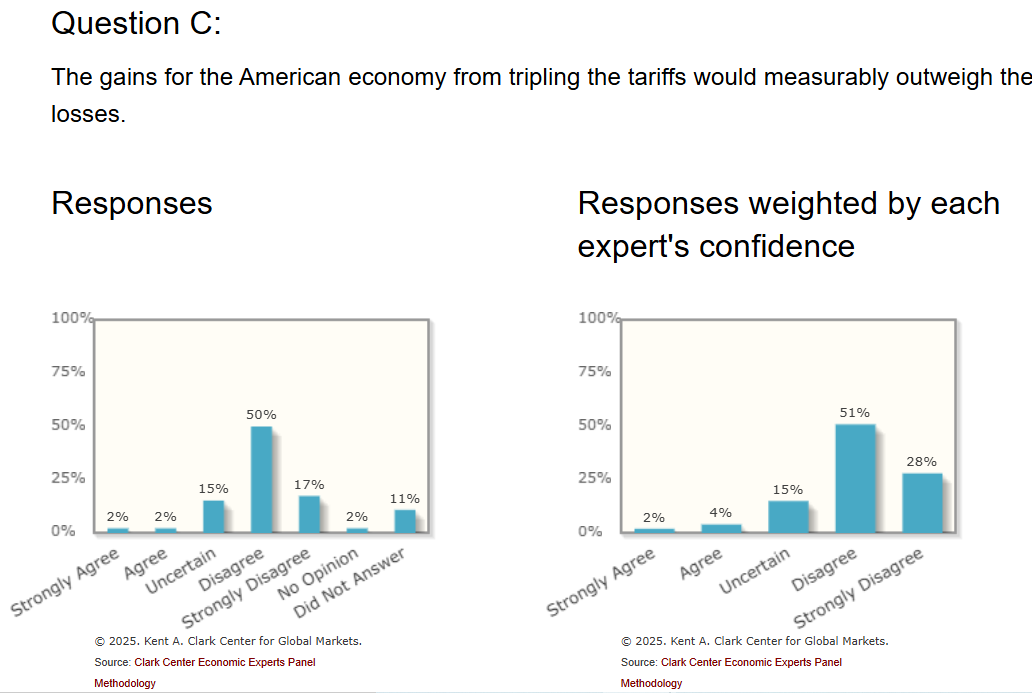I cannot emphasize enough to you how unfathomably stupid this all is. Economists don’t always agree on policy. But virtually all economists - left, right and everything in-between - agree that tariffs are bad policy that make all parties worse off. Here’s a survey showing 95% of economists think tariffs reduce economic welfare. Here’s another where 95% of economists say that consumers bear the burden of tariffs through increased prices. In that poll, the single economist who disagreed appeared to have misread the question. I could list dozens of these for you, but here’s one more: