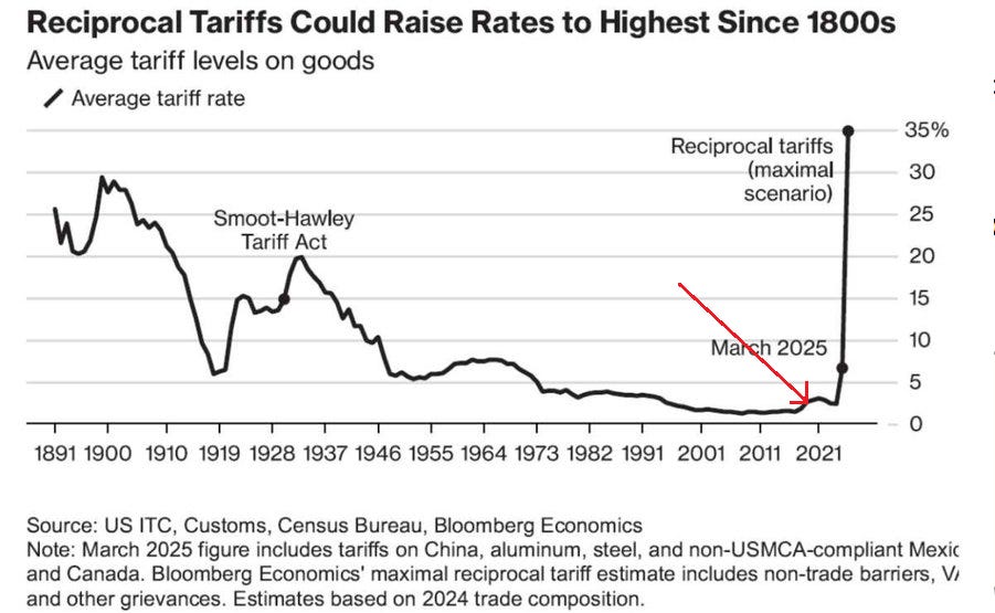 That red arrow that’s pointing at the little bump is the impact of Trump’s first term tariffs. The tariffs announced in Trump’s second term are at least ten times larger, maybe more. They’re larger than the Smoot-Hawley tariffs which are widely blamed for worsening the Great Depression. We are tariffing countries at levels literally never seen before in American history. Some countries are getting hit with 40%, 50% or higher.