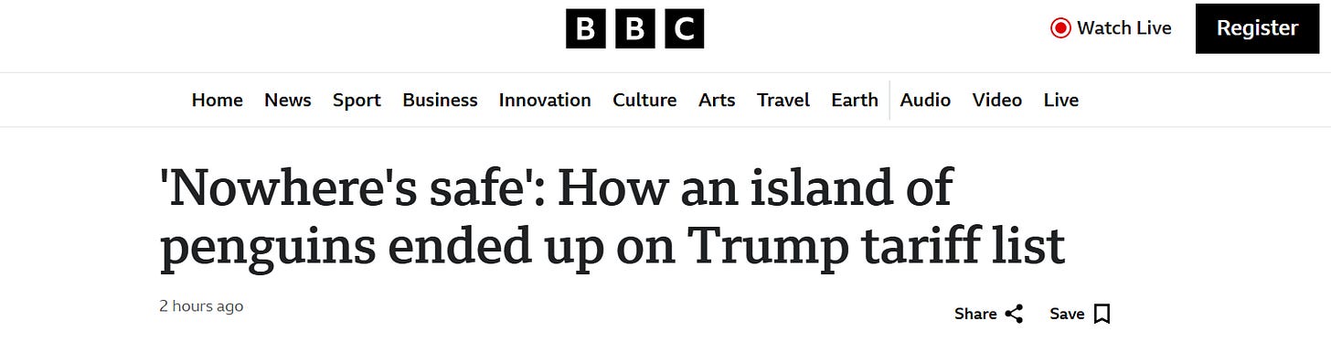 Trump’s list of new tariffs bizarrely included islands with no human population - like the Heard and McDonald Islands, which are a remote territory of Australia populated only by colonies of penguins. It appears that what they’ve done is go into the list of ISO country codes and just apply their simple formula to every entry without bothering to check which places are even countries. It’s how we ended up putting tariffs on the British Indian Ocean Territory, which has zero permanent residents outside of a US/UK joint military base. Yes, Trump just put a tariff on an active American military base.