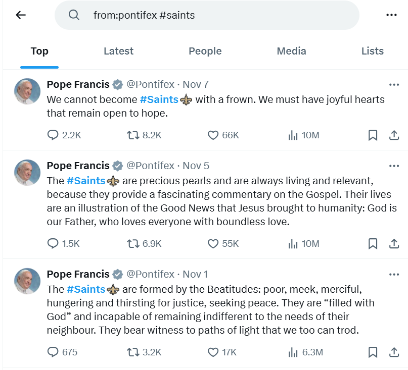 Also in adorable Vatican mishaps: The pope is repeatedly using the #Saints hashtag, apparently not understanding that it’s hardcoded to support the New Orleans Saints football team: