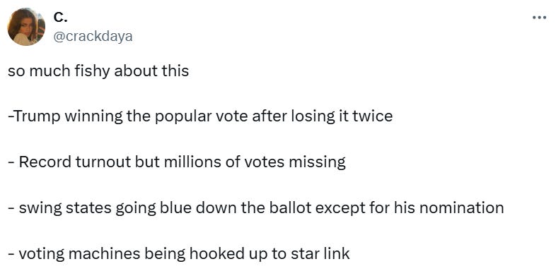 Speaking of Threads! Apparently the one thing a certain kind of liberal learned from Donald Trump is how to do election denial. Taylor Lorenz has an interesting report in User Mag about how Threads is filled with election denialism. I guess this makes sense - all the most rabidly anti-Elon people are the ones who left Twitter. But on the other hand, I’ve been seeing viral posts about this on Twitter as well: