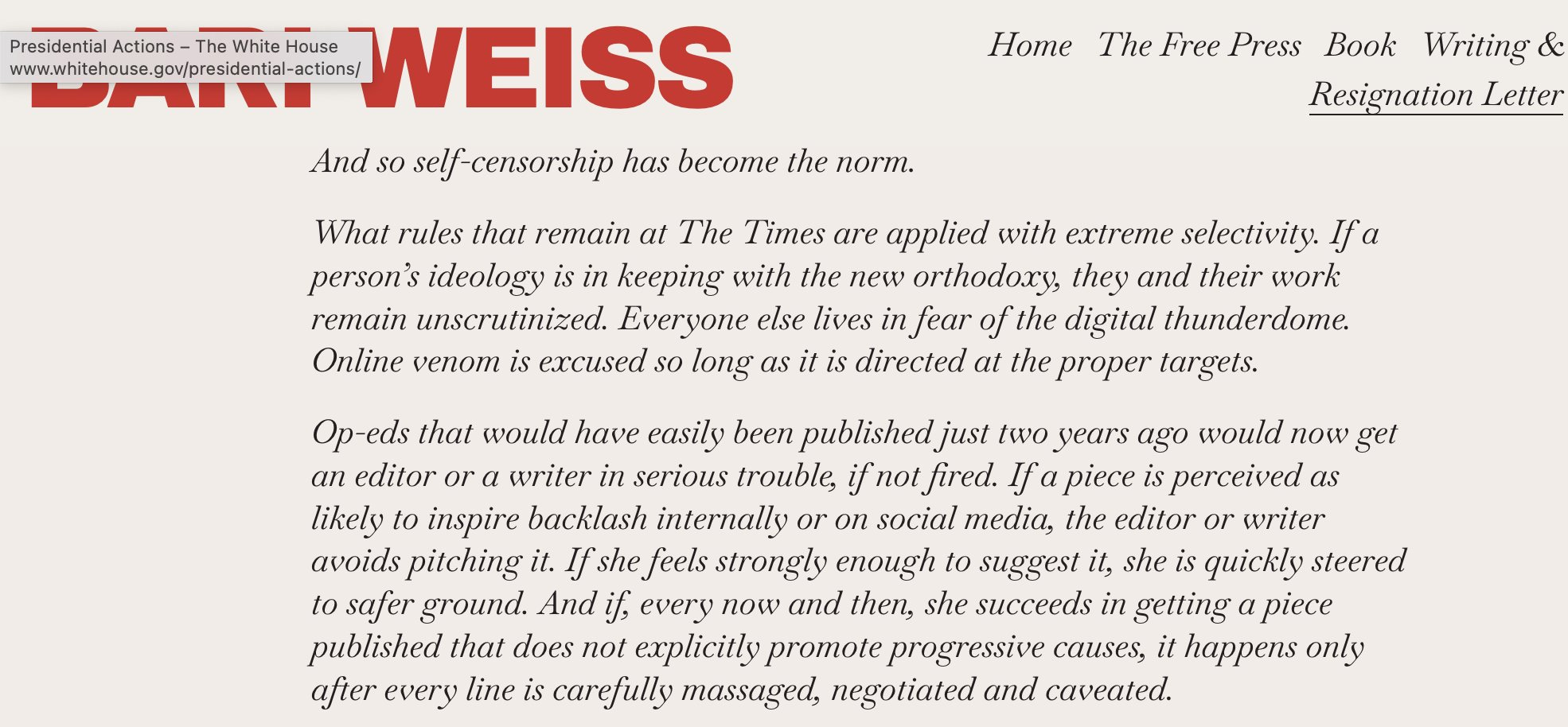 “Only after every line is carefully massaged, negotiated and caveated” - Weiss was perfectly aware of how editorial demands for perfection can be weaponized when it was the progressives at the New York Times doing it to her columns. She is, to the great disappointment of her critics in the media, not an idiot. She’s just fine with wielding that cudgel when she’s in power.