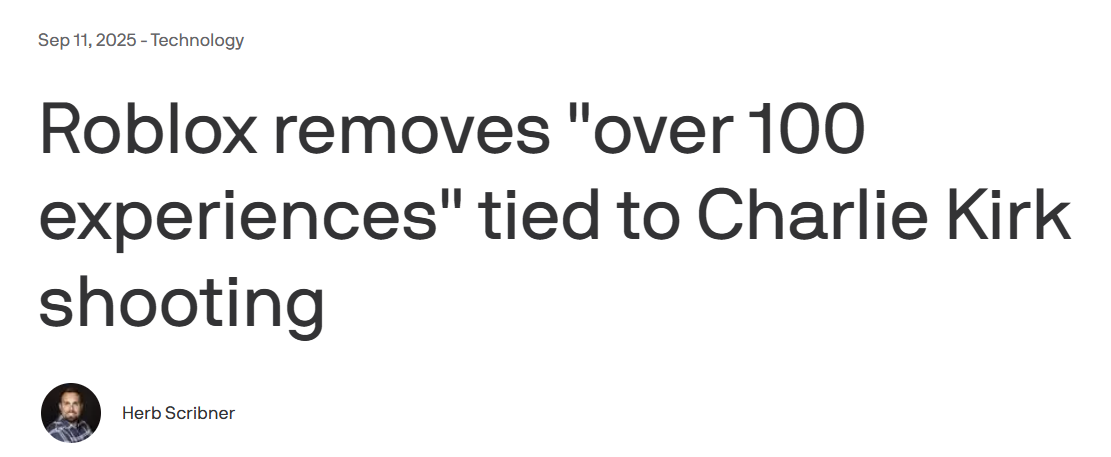 Again: corners of the internet you don’t follow and can’t really understand are turning shootings into a form of irony-laced meme culture, and it’s even happening with preteens on Roblox. ‘Experiences’ are the user-created content that makes up the backbone of Roblox game play, and I’m not surprised at all that within hours of Kirk’s murder users on Roblox were recreating, remixing and memeing it like it was a pop song. This is where youth culture is being created today, because however big you think Roblox is, it’s actually much bigger than that: