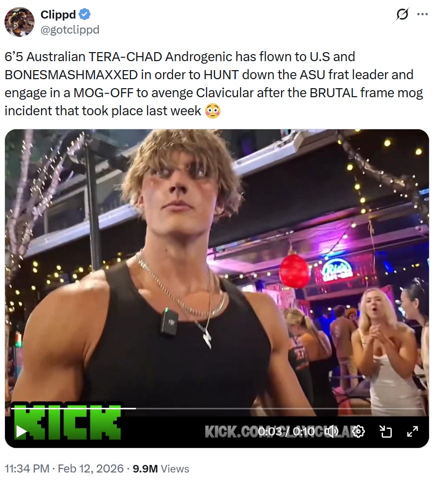 I was wrong! I was so, so wrong. The chadmaxxing/mogging conversations have continued and even surpassed Clavicular himself. There’s an entire ecosystem of absurd men and they’re the most clippable people on the planet. Remember the ASU frat leader who brutally frame mogged Clavicular? Well an Australian looksmaxxer has sworn to avenge him: