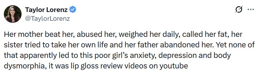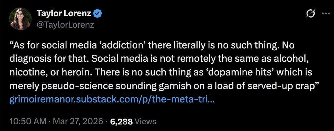 Long time readers will know that I’m very aware of the potential harms that social media can have on young people. I’m Haidt-pilled. And yet I’m pretty uncomfortable with the logical consequences of allowing individual users to sue platforms for emotional distress. The argument in this case was essentially that as a minor, the plaintiff was depressed and the platforms made her addicted and even more depressed with clever algorithmic design, infinite scrolling, etc. I hate to hand it to Taylor Lorenz, but I’m not sure she’s wrong here: