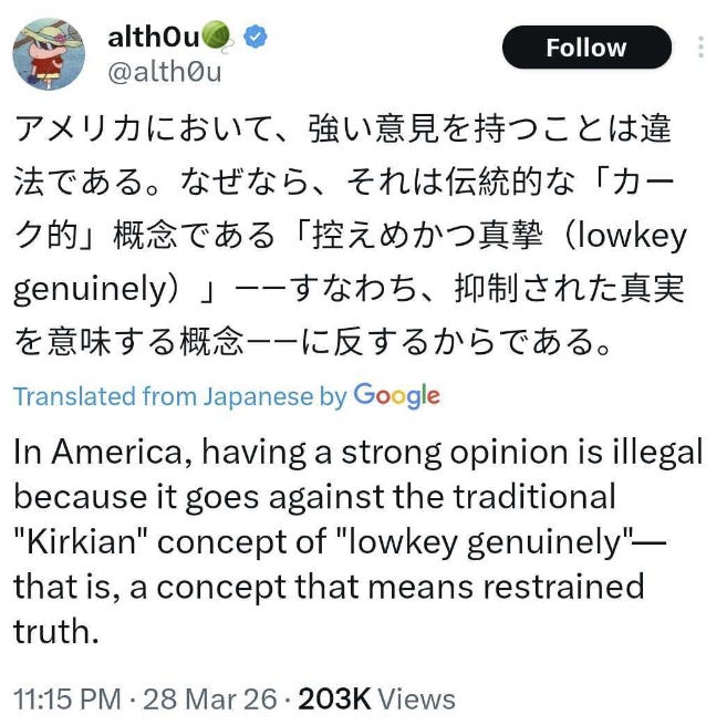 Let’s kick off with something that was, for the most part, incredibly wholesome. The App Formerly Known As Twitter changed its algorithm last week and started promoting more posts into the For You feed from other countries, automatically translating using AI. In practice, the two biggest languages on X are Japanese and English1, so this meant a lot of English-language posts showing up for Japanese users and Japanese posts for English speaking users.