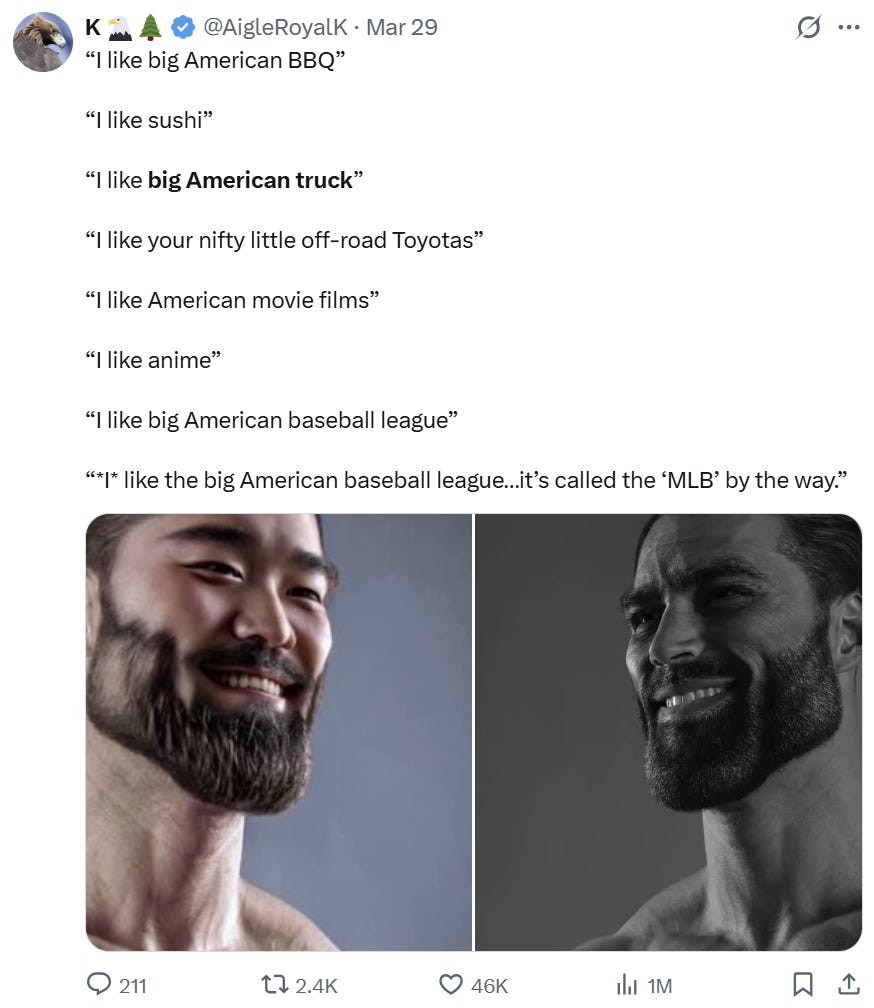There’s cultural sharing of all kinds. Americans are explaining the nuances of ‘lowkirkenuinely’. Japanese folks are talking about how friendly Americans are. Both sides are creating race and language-swapped versions of each other’s memes, including this Japanese chad: